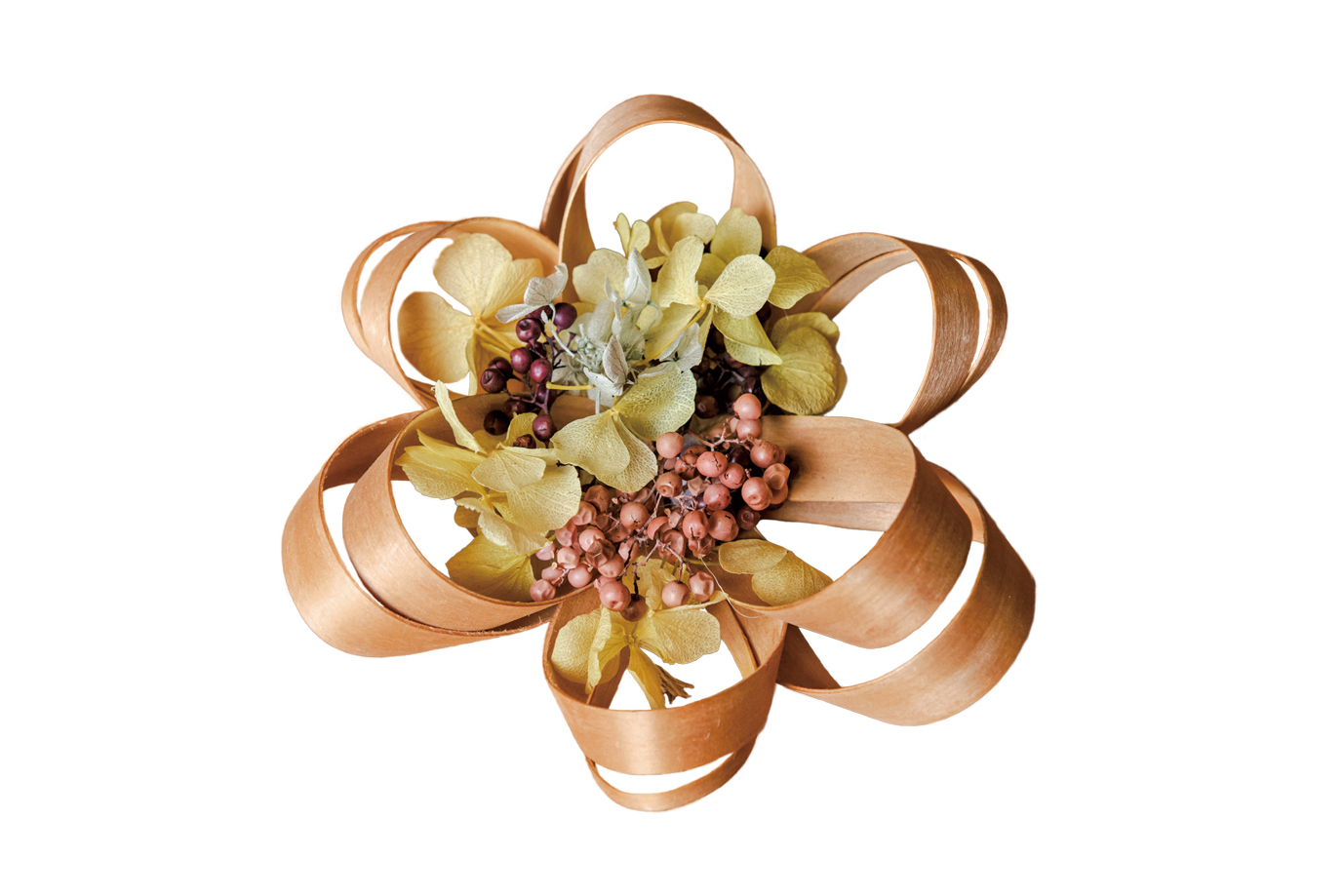 「小さい時、女の子に『将来、何になりたい?』って聞いたらよく『ケーキ屋さん』とか『幼稚園の先生』とか答えるじゃないですか。たぶん私は、『お花屋さん』って言ってたと思います。面皮って曲がるし、お花の形にできないかなあと思って10年くらい前にちょっと曲げてみようかしらとやってみたのが始まりです」花井商店の花井慶子さんは面皮でアクセサリーや髪飾りなどの小物やオブジェを製作・販売するアーティスト活動を行っている。